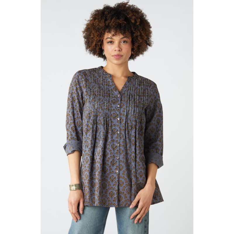 Button-front tunic blockprinted in shades of dusty blue and green. The long top with hand embroidered pintuck pleats gives a flowy sweep from the shoulders. Long sleeves with button cuffs.