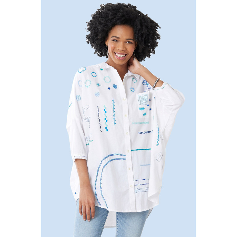 Made of eco-friendly organic cotton, this generously-cut shirt showcases embroidery designs which were initially developed as a sampler training exercise for the artisans. The result is an embroidery sampler showing their expertise. With dropped shoulders, embroidered back yoke, and tapered three-quarter length sleeves that narrow to the cuff. Consider sizing down for a less oversized look.