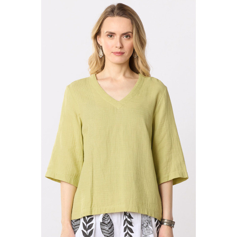 Soft and drapey, this spring-green double gauze top with a V-neck will become your new favorite. Tone-on-tone embroidery accents the shoulder.