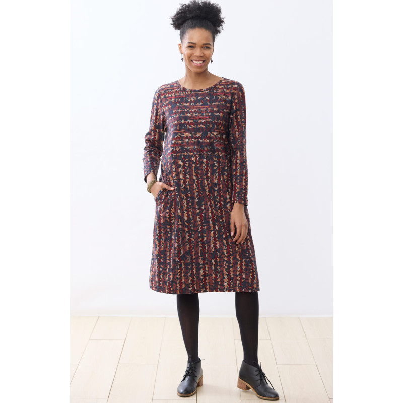 Rich colors and easy style. Intricate batik and block prints in autumn reds and browns complete the style of this easy pullover jersey dress. Hand embroidery highlights the bodice.