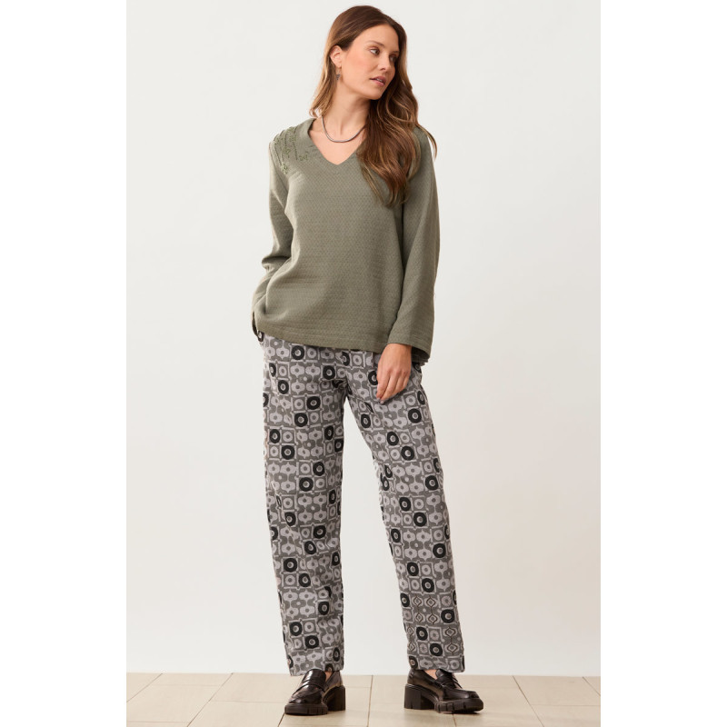 Autumn-weight French terry straight-leg pant is blockprinted in shades of black and grey. Full elastic waist. Hand embroidery highlights the print design at the hem.
