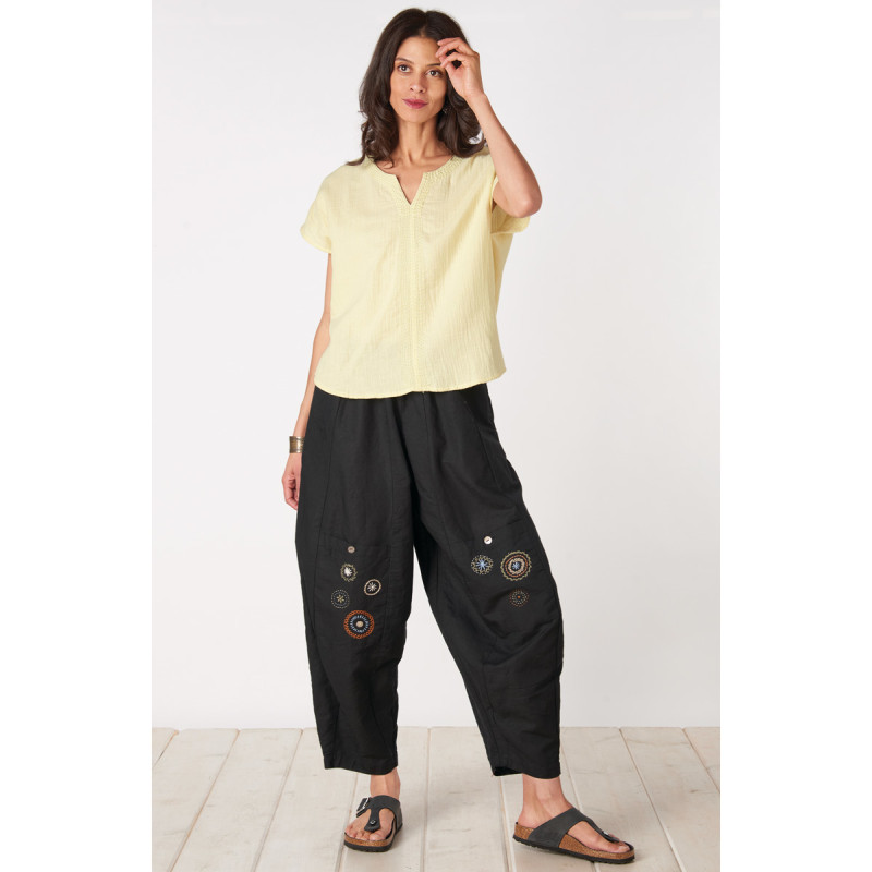 Your newest essential: a contemporary version of workers' field pants in a linen/cotton blend. Lantern-shaped leg and full elastic waist. Buttoned cargo pockets feature contrast hand embroidery. Generously cut.